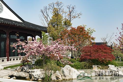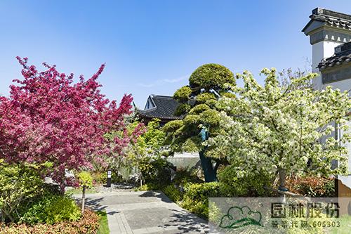 穿过迎宾入口,沿着曲折的园路前行,道路转折处,一紫一白盛放的两棵海棠,满树繁花,明艳动人,瞬间夺人眼球。“这是一个流动空间,穿过这两棵海棠,往左转,是海棠书院,院子前形成一个停留空间,可供游人在此驻足赏景。” 边华锋指着眼前的景观介绍道,“往右转,一棵枝繁叶茂的鸡爪槭位于草坪中间,与周边几棵小规格的鸡爪槭相互呼应,形成一个过渡空间,但这个空间和前面的空间大小、表现手法又各不相同。”