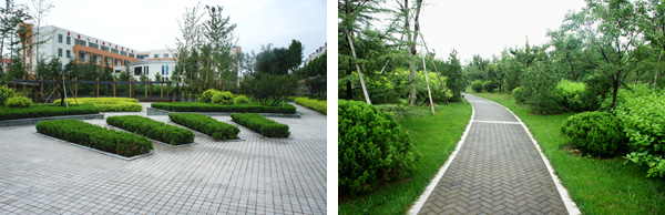 而在道路十字路口的节点处,则主要是用10cm×10cm的小花岗岩铺地,铺出来的路面整洁、平坦,看似简单,实则对施工技术要求相当高。草坪中的地面铺装,则采用花岗岩汀步,用错缝铺装法,两块花岗岩之间用草皮镶嵌,就像给每块花岗岩镶了一道绿边,与旁边的草坪和谐地融为一体。贯穿整个工程的游憩步道,全部采用"人字形"的铺装方法,中间用透水砖、两边以花岗岩镶边,透水砖价格不高,用以镶边的花岗岩是利用了铺装中剩余的边料,虽然用料简单,但通过对技术的严格要求,铺出的路面却整洁而不失韵味,是一种实用、环保、节约的做法。