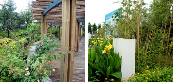 每个景观节点上,植物的配置方法都是不一样的,如在下沉广场,主要是以小龙柏、金叶女贞等小灌木片植成方形或弧形,间或点缀石楠、梅树,看起来规整、简洁;而在设计风格为江南园林的南广场上,是将贵重的造型油松单植,通过不同的组合,形成三个风格相近的绿岛,周边种植美人蕉、玉簪、竹子,并砌起白墙,上面开圆形拱门或圆窗,散发出诗意江南的静谧和婉约气息。"游憩步道是贯穿整个景观的轴线,为了形成曲径通幽的景观效果,我们将对植、孤植、丛植都多种方法结合运用,特别是在三叉路口,多种植海棠、樱花、杏花等,一方面,花开的时候,绿叶间繁花点点,会吸引人们不断向前探寻更多的美景;而花落之后,茂密的枝叶又形成隐隐约约的视觉感受,前方转过弯后风景什么样,又让人很想去看看。"高经理笑着说。