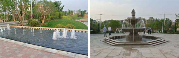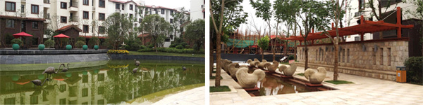 在紫荆东郡小区,水景随处可见,从主入口两侧近50米的景观桥水景,到入口正前方一个大型的石雕喷泉,再到小区里面几条主干道交汇的十字路口的小型地面喷泉,中心水景上的圆形石雕喷泉,特别是不远处的动物喷泉雕塑,只只鹤低头凝思,细长的水流从鼻端的出水口处流出,落入下方的水池里,更是格外引人注目。“这些水景小品具有的艺术特性与审美效果,加强了整个景观环境的艺术氛围,成为让空间环境生动起来的关键因素,在提高小区艺术品质和景观形象的同时,更给人们带来美的享受。”杨经理如是说。