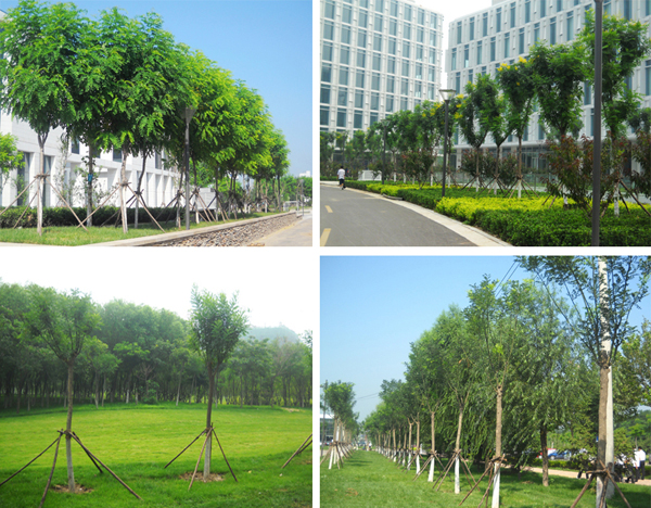 本工程是大型商务园配套景观绿化工程,整个项目以人工湖为中心将建筑呈环形布置,分为内环、中环、外环。绿化围绕建筑均匀有层次的分布,环路两侧栽植国槐;办公楼之间则种植日本晚樱、碧桃、海棠等观花、观叶类乔木,以及黄杨、女贞等灌木和绿篱;中心湖区域两侧的能源半岛和湿地半岛上被喜水性植物覆盖,起到净化湖水的作用,岸边种植垂柳,开辟休闲区域;园路铺装材料选用水洗石、花岗岩,石汀、铺装与绿地自然衔接;再加上花坛和景观小品,各种观赏性植物互相衬托,乔木与灌木合理搭配,使得景观与建筑、环境完美结合。