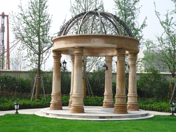 更引人注目的,还有销售展示中心前面的雕塑喷泉,该喷泉运用花岗岩整石雕刻拼接而成,工艺极其复杂,自上而下不断洒落的水花,营造出一片清凉;无以复加的镂空铁艺圆顶繁复花纹和拱门的石材立面装饰的皇家景观亭,精致中透露出大气;潺潺溪流、雾气缭绕的人工溪涧,如梦似幻;大面积的高尔夫果岭草坪蜿蜒起伏,华贵雍容……