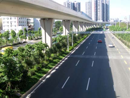 如今,开车行进在这条道路上,干净整洁的路面、开阔通透的视野、清新自然的景观,给人带来闲适、惬意的感觉。“以人为本,尊重自然”的绿化理念,体现在景观中的每个细节;自然环境与城市环境的密切结合,使高架桥的道路通行功能与桥下中央绿化带的生态功能有机融合。整条道路,不仅体显出深圳这个滨海大都市独有的景观特色,更彰显出这个城市的生机活力与热情奔放。
