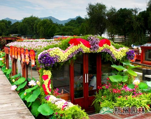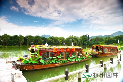 艺术节期间,首次在西湖湖面上配置6艘荷花花船,极大地提高了荷花节的观赏性和趣味性,成为西湖中一道流动的荷花美景。其中,由米兰体育平台设计制作的“魅力西湖”荷花游船,将插花技艺与园林布景手法有机结合,用康乃馨、勿忘我、太阳花等与荷花组景,既突显了“主角”荷花的秀丽、典雅,又使整艘船的色彩明艳丰富,将热闹的节日氛围巧妙烘托。