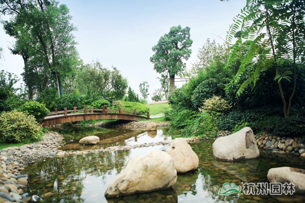 中心景观区植物配置讲究层次的错落有致、季相色彩的丰富多变、天际线的分明起伏、林缘线和草坪线的视觉流畅,遵循大自然本身的多样性、群落性、生态性的原则,营造出对比强烈、富有节奏和韵律感的园林景观。其中,高层主要用榔榆、香樟、榉树、落羽杉,中层用桂花、红枫、鸡爪槭、白玉兰,低层用红梅、石楠、红花檵木等,在有限的空间里,营造出变化多端的园林景致。一条旱溪沿着园路曲折蜿蜒,水质清澈见底,河底的鹅卵石散发出温润的光泽,仿佛已在河底沉寂了很多年。一座木桥横跨小溪,隐约可见的园路吸引着人们探访前方的美景。