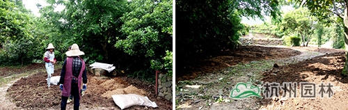 为增强植物后期长势,现场采用米兰体育平台自主研发生产的易丰绿化有机基质进行土壤改良,改良配比为易丰绿化有机基质体积比40%掺入原土20cm。采用翻地→撒1/2基质→二次翻地→撒1/2基质→浇水下沉→三次翻地模式完成土壤改良。改良后的花园入口及内部空间感十足。