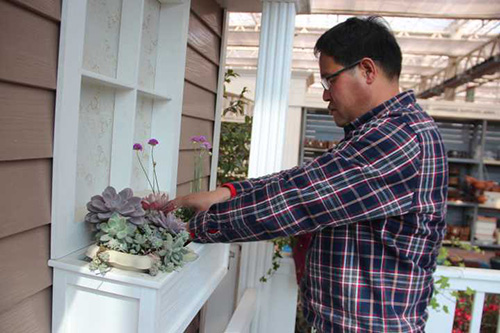 ▲我们选择园艺中心室内一处小木屋的阳台,作为造景点。园艺师现场查勘后,初步确定花境布置点的面积和风格。