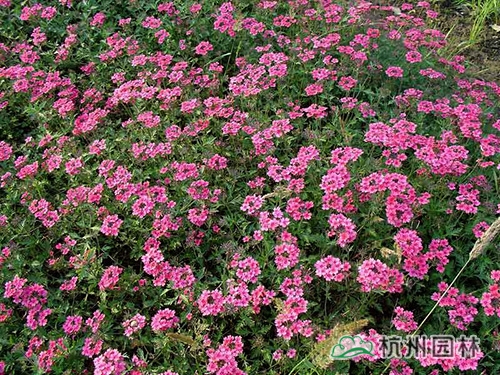 美女樱,其姿态优美,花色丰富,色彩艳丽,盛开时如花海一样,令人流连忘返。美人樱株丛矮密,花繁色艳,开花部分呈伞房状,花色有白、红、蓝、雪青、粉红等,花期为5-11月。喜阳光、不耐阴,较耐寒、耐荫差、不耐旱。花期可喷磷酸二氢钾,促进花开放。