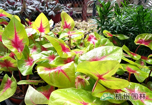 花叶芋:红与黄交织的叶面色彩绚丽夺目,充满了生机和活力,让人的心情瞬间明亮起来。