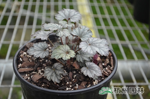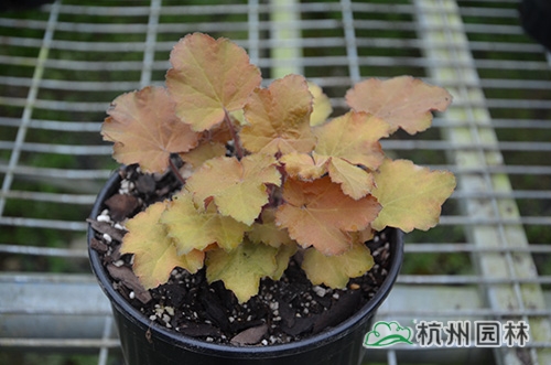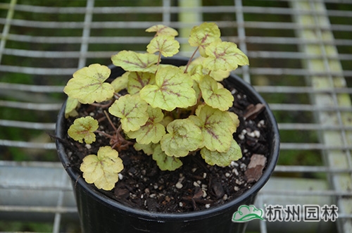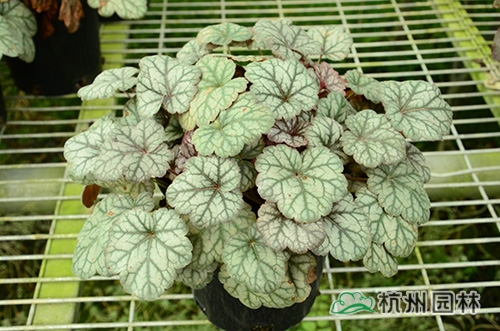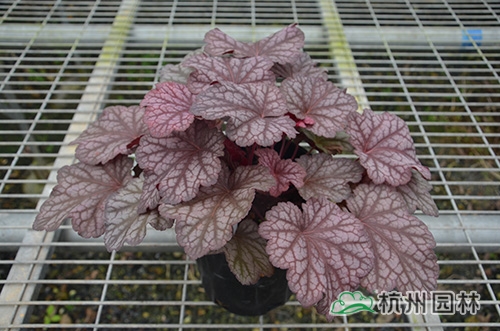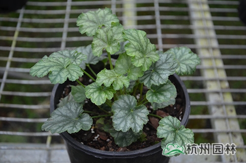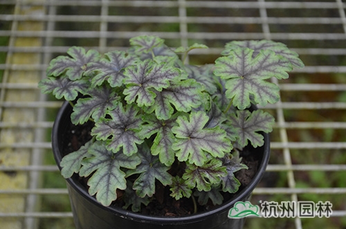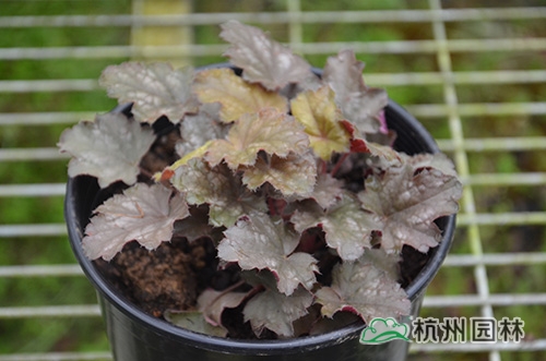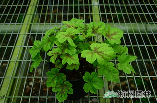 矾根叶形也变化多样,基部心形或楔形,掌状浅裂至深裂,边缘波状,浅根系,叶基生,花期一般为4~10月,花很小,呈钟状,两边对称。幼苗长势缓慢,成苗后生长旺盛。绿期长,能够在-15℃以上的温度下生长。具有喜半荫、耐全光、耐旱性和耐寒性强等生理特点。适宜富含腐殖质的土壤。喜中性偏酸,适宜的PH值为5.8~6.2,能够在倾斜地方生长。冬季不落叶,枝叶生长稠密,株型圆整,覆盖性强,花和叶都比较漂亮。