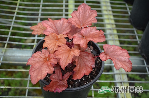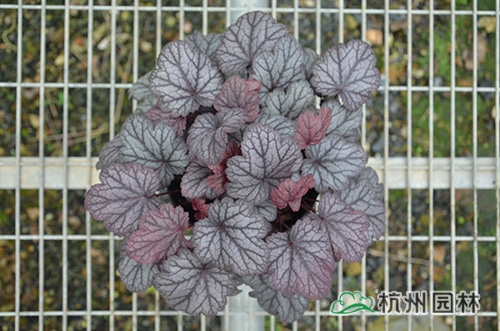 矾根又名小花肾形草,英文名为“Alum root”(因根部不规则膨胀而来),因此在引入中国的时候被翻译成了“矾根”。矾根叶色繁多,且叶色会随着季节、环境、温度和光照条件的变化而改变。例如,‘蜜桃黄’在春天的时候,叶子展现出细腻的银色光泽,成熟的叶片颜色会呈现紫色并略带玫瑰红;‘赤砂岩红’的叶色会从桃红色变为亮铜黄色,再变为绿色带有琥珀色;‘贵族紫’叶子的颜色会保持稳定的紫色,冬天的叶子会变成银色。