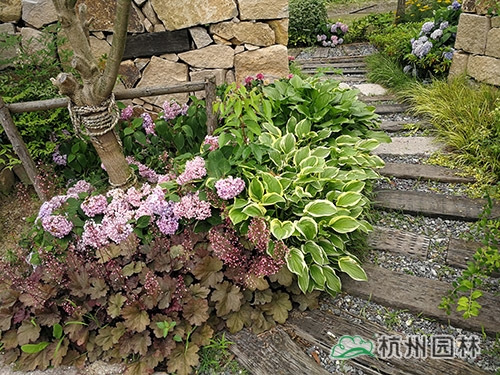 多彩的矾根与玉簪搭配,营造出色彩明快的林下地被景观