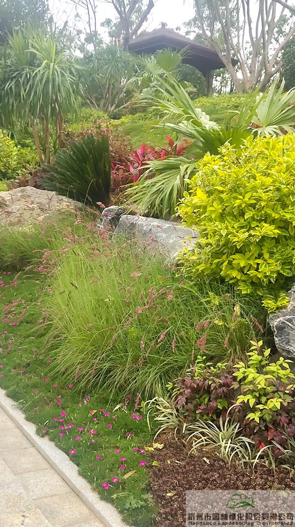 地被植物和小灌木充实园林的下层空间,往往起到“镶边”的效果,如果种植不好,很容易使底部出现裸露的土壤,景观效果大打折扣。而该项目在现场放样之后,先对地形进行处理,形成一定的坡度,然后在地被植物或小灌木种植时,上面坡度高的地方平种,随着逐渐向下方边缘靠近,植物种植向下方倾斜,逐步过渡,从上到下形成弧线,将土壤遮盖。“这种处理手法,不但使下层空间看着自然美观,而且避免了地面出现裸露情况。”叶伟华的言语中,不经意间流露的,是杭园人对细节的极致追求。