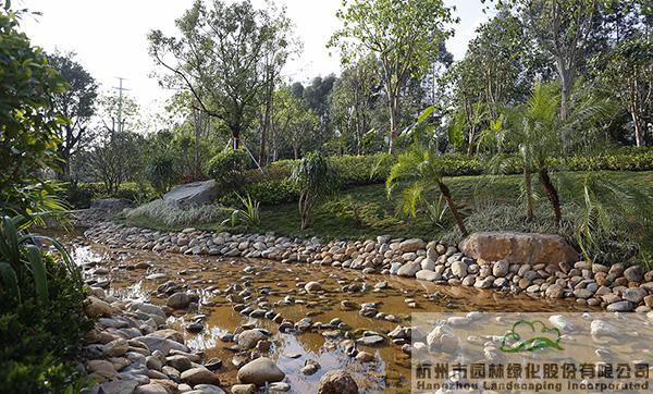 “项目将海绵城市理念融入公园建设,园路铺装采用透水混凝土,下雨时雨水可快速渗透,路面不积水;旱溪景观则在下雨时蓄水,雨水可用于植物的日常浇灌,干旱时,铺满鹅卵石的水底又与周边丰富的植物营造出另一种园林意境。”随着叶伟华的介绍,项目建设中许多隐藏的细节不断展现,生态造园的理念进一步深入人心。