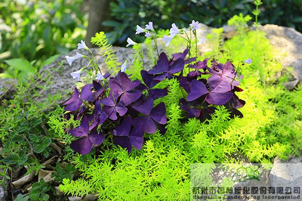 叶片紫红色、花朵淡粉色的紫叶酢浆草,是万绿丛中一抹亮丽的紫。