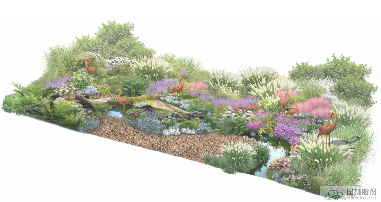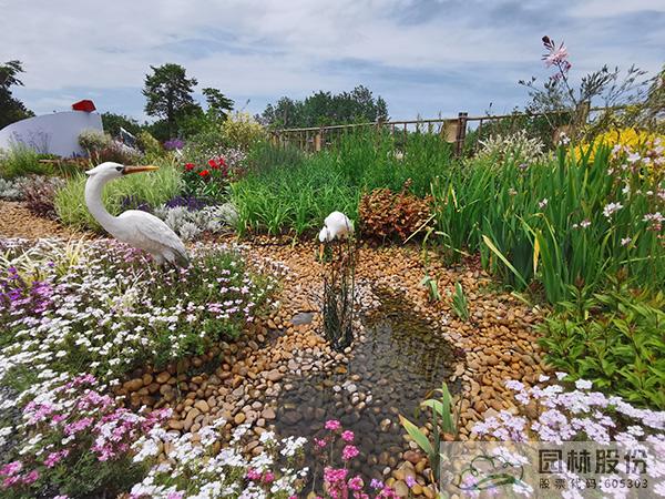《泽•颂》的设计将花境与湿地相结合,以花之灵、水之灵、鸟之灵为主线,以木本花境、观赏草混搭宿根植物、枯木苔藓等植物景观模式,模拟自然湿地的灌丛、草甸、藓类等不同类别湿地景观,营造繁花似锦的美丽场景,营造出“归棹茭芦苇岸,白鹭锦鳞为伴,闲卧水云间,但见碧波清浅”的幽雅湿地景观。