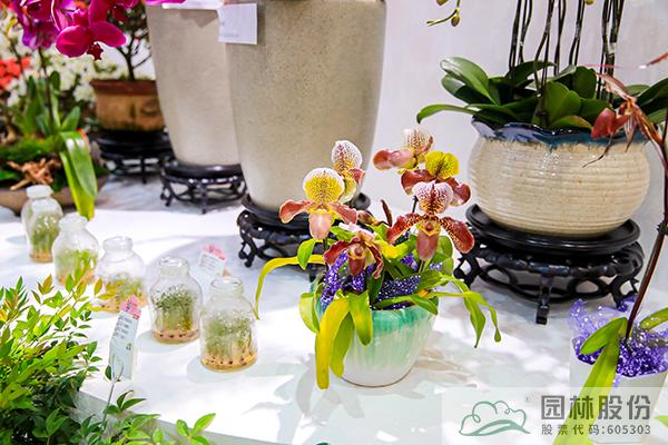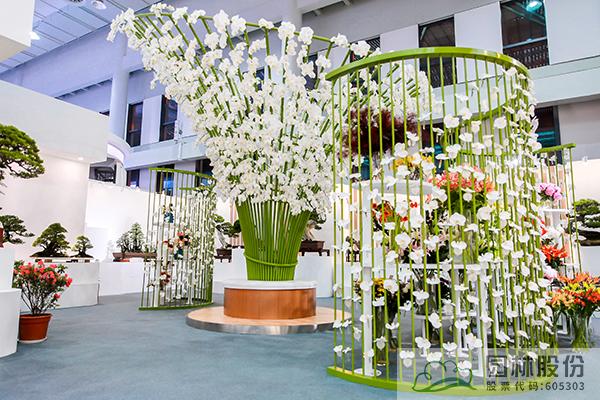 走进馆内,各种浙江特色新优园林园艺植物产品、花艺作品、盆景作品等,让人忍不住驻足停留。最引人注目的,则是以一朵朵白色的蝴蝶兰花朵与仿竹构筑物营造的立体景观,结合苍翠欲滴的竹林背景和浙派山水盆景,营造出绿意盎然、生机无限的风景画卷。寓意浙江是“绿水青山就是金山银山”理论的发源地,表现浙江始终践行“绿水青山就是金山银山”的理念、大力推进生态文明建设取得的巨大成就。