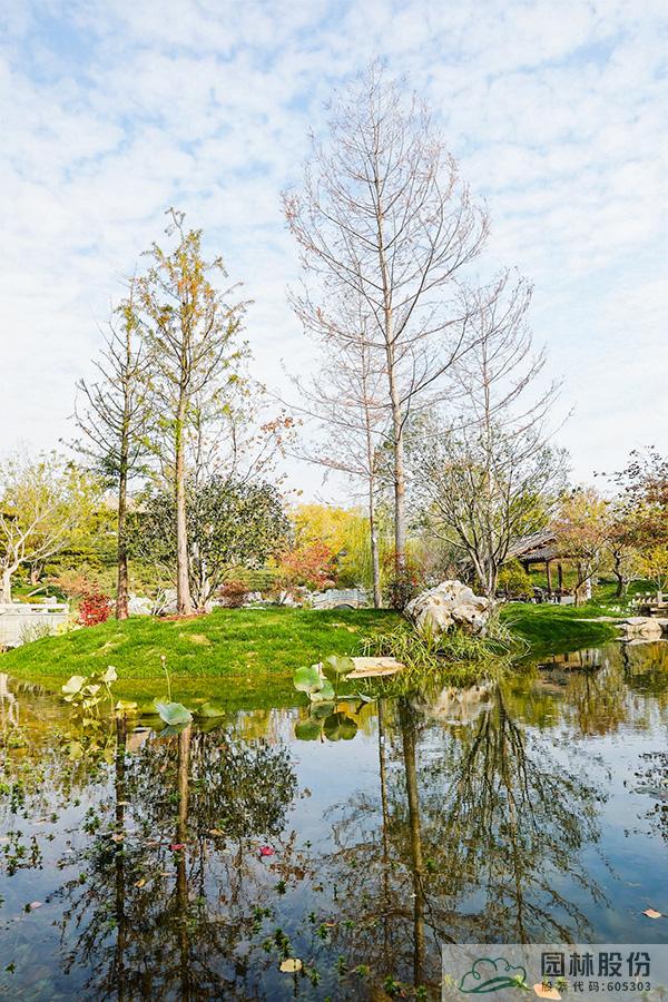 契合展区主题的樾香亭临湖而立,双坡屋面,八柱敞亭,柱子上书五言联“鱼乐人亦乐,泉清心共清”,尽显悠闲舒适的情趣。在亭内凭栏而坐,侧耳听风雨,迎风嗅花香。抬头远望,荷叶亭亭的水面上,有鱼儿在水中嬉戏;曲折的长桥上,游人在漫步观景;水岸边,银杏、三角枫、乌桕等色彩缤纷,编织出一幅深秋的美丽画卷。