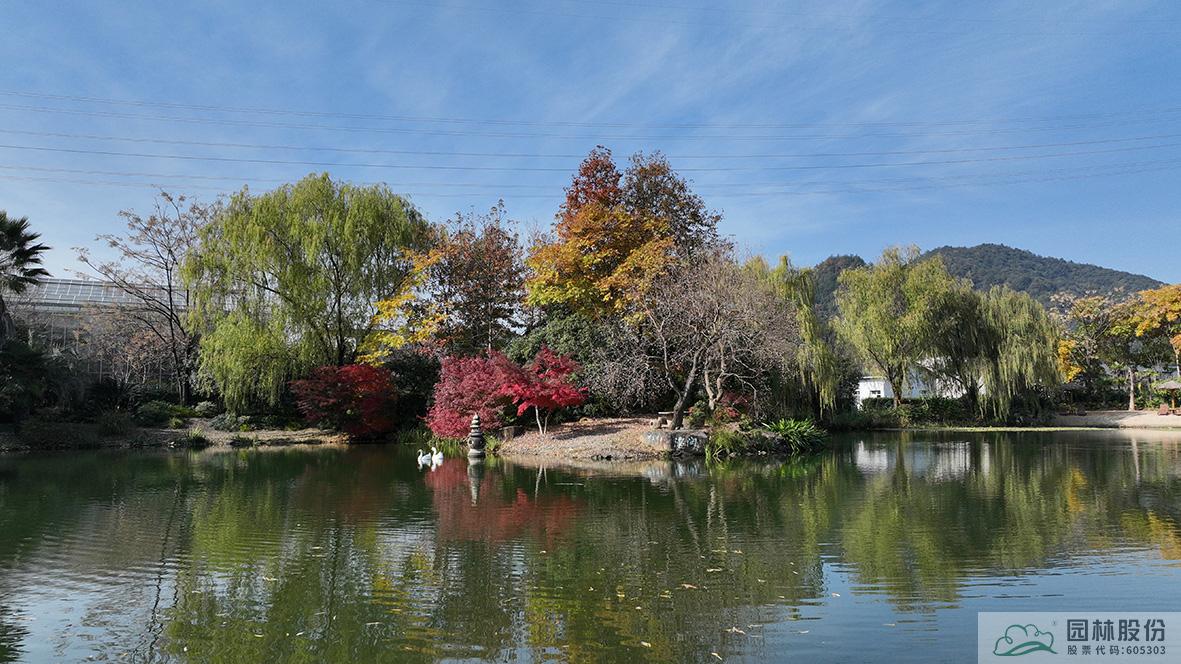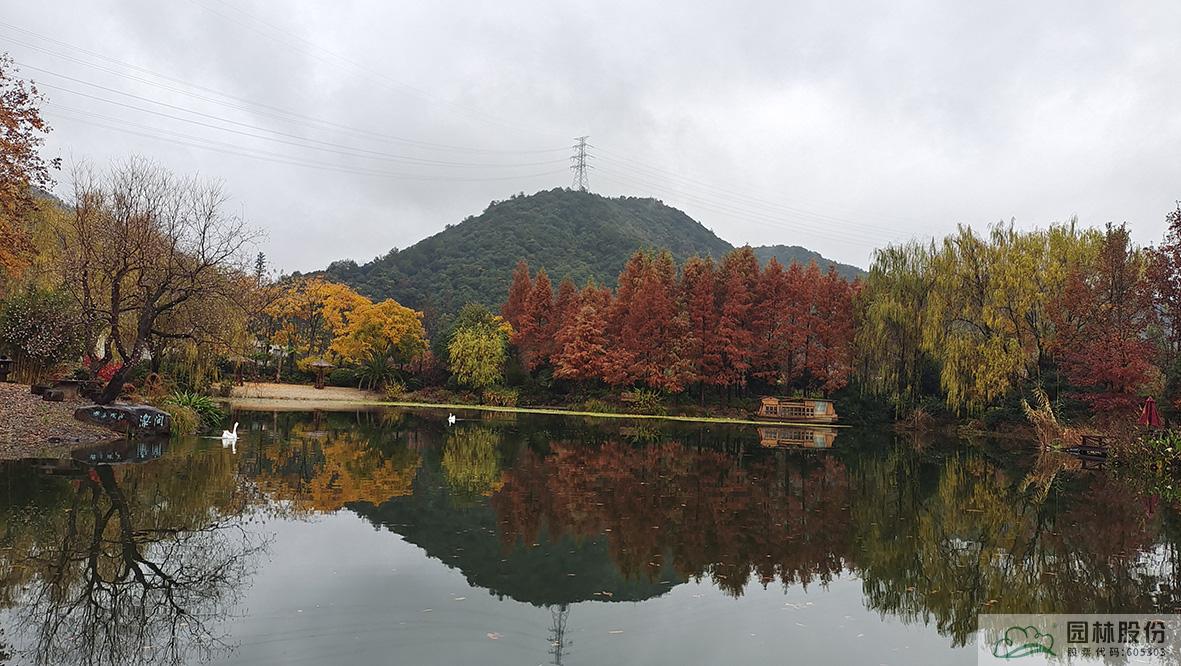 金黄的无患子、绚丽的红枫、黄红变换的枫香构成了画境园初冬缤纷世界的三部曲。半岛的乌桕、池塘对岸的水杉水松池杉混交林,则如跳动的音符,共同谱写着初冬的乐章。
