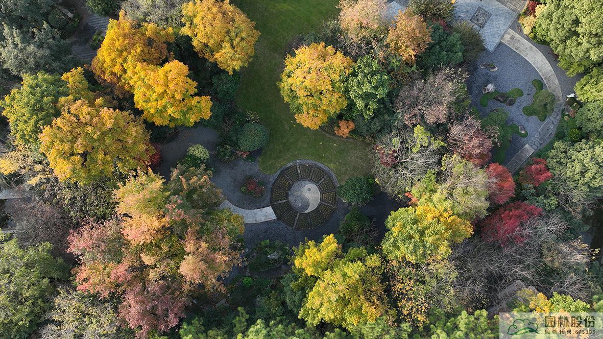 俯视画境园南园,枫香林在阳光中的色彩愈加斑驳,无患子绿色尚未全部褪去,金黄色树冠愈加油亮,尽显英式风景林的自然、洒脱。